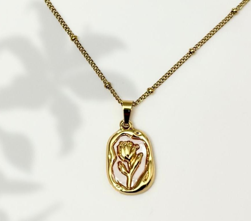 A delicate piece featuring a hand-detailed floral pendant on a sleek bead chain. Inspired by nature, this design adds a soft, feminine touch to your everyday look.