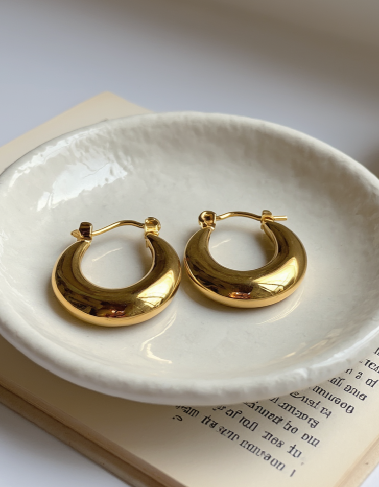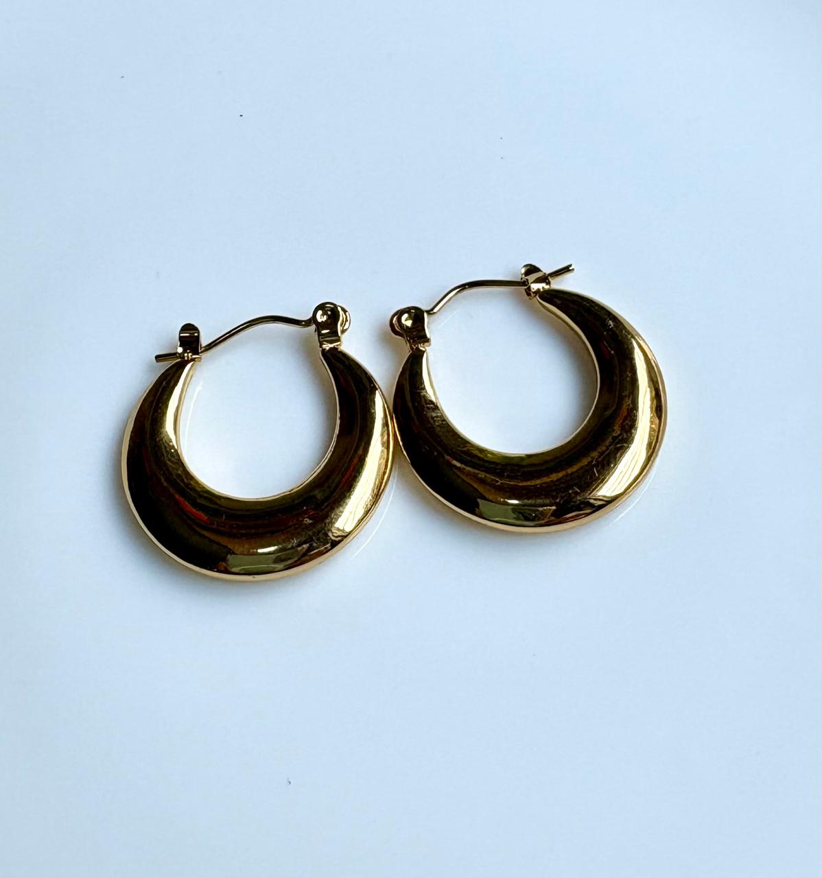 Timeless gold-toned crescent hoops with a smooth, high-shine finish—perfect for everyday elegance or layered ear styling.