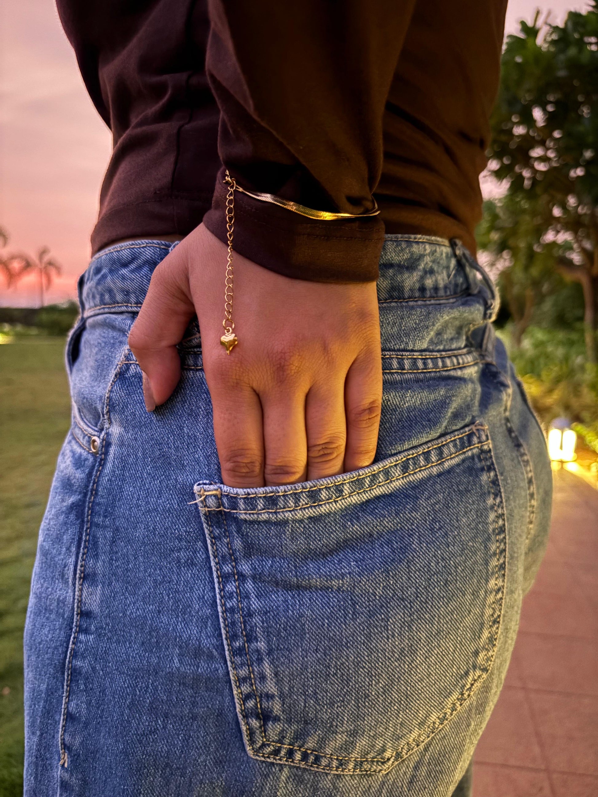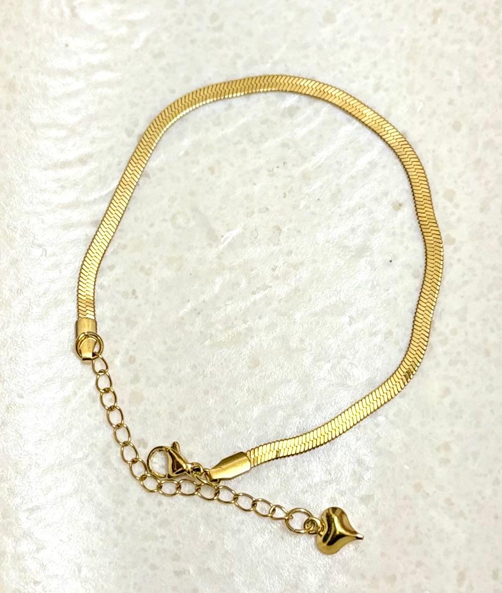 Add a touch of romantic charm with our Gold Heart Snake Chain Bracelet. This unique piece combines a smooth, polished gold-toned bangle with a delicate chain that elegantly suspends a tiny, puffy gold heart charm. Perfect for those who love subtle movement and a sweet, stylish detail.