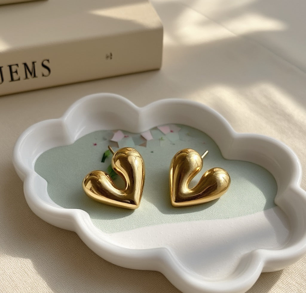 Petite heart-shaped studs with a glossy molten finish, plated in 18K gold. Lightweight, elegant, and perfect for everyday wear.