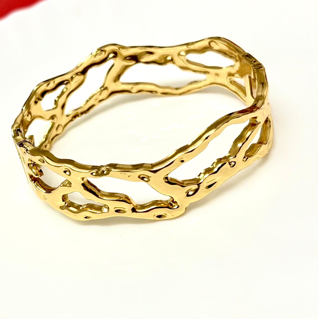 Molten textures and golden drips inspire this organic-shaped cuff. Artsy, unique, and seriously chic, a wearable sculpture for your wrist.