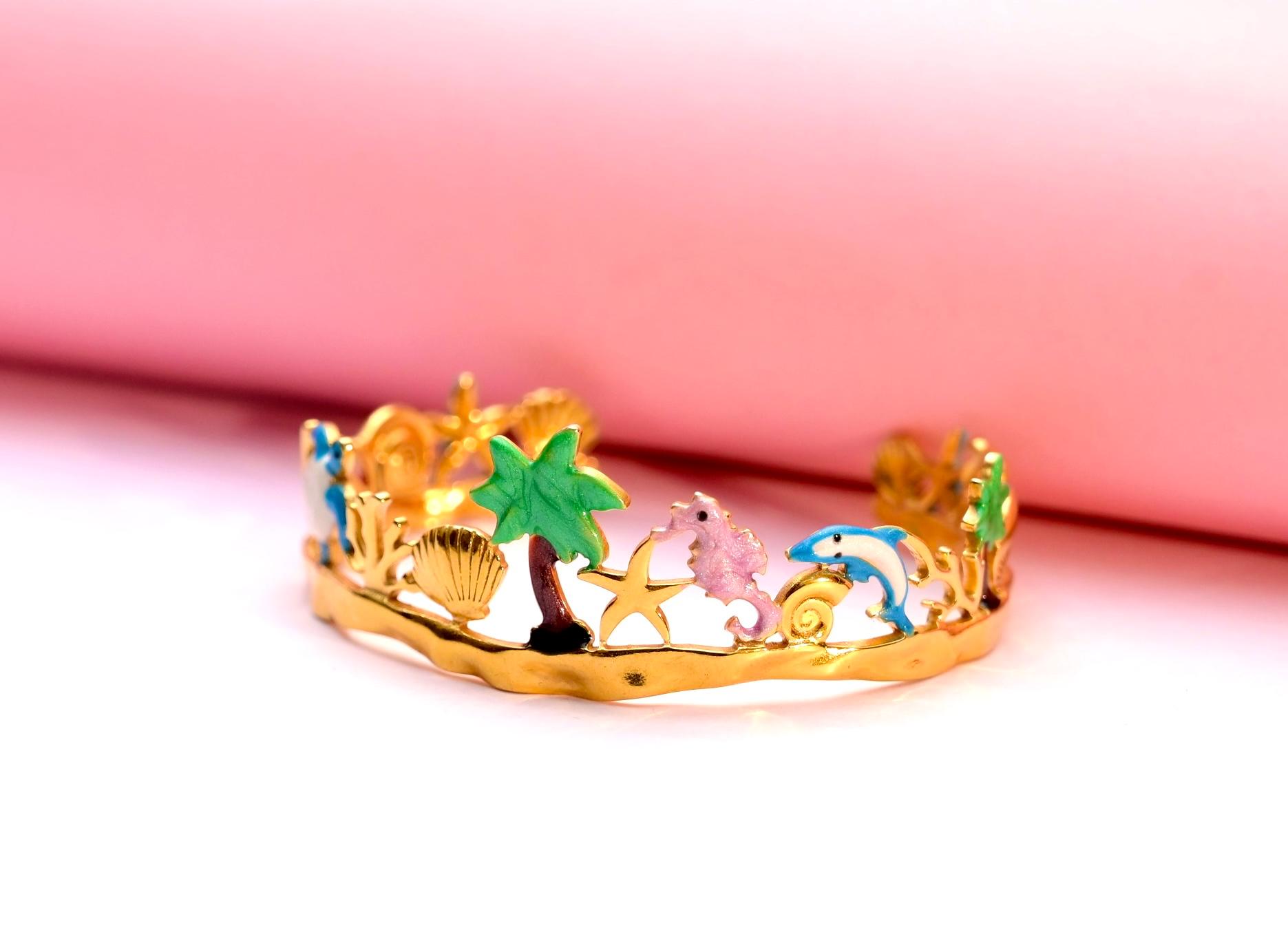A vibrant gold-toned cuff bracelet inspired by the beauty of the sea, featuring playful enamel designs of dolphins, seashells, palm trees, and starfish. A statement piece that brings tropical charm and coastal vibes to your style.