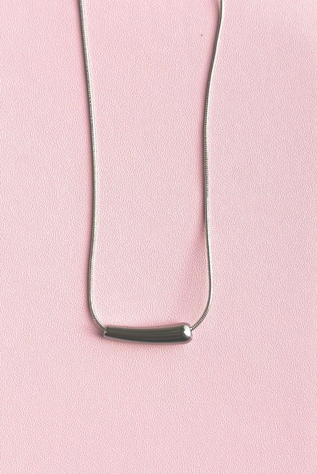 A modern silver-toned necklace featuring a smooth bar pendant. Its minimalist design makes it a versatile accessory, perfect for layering or wearing solo for a chic, understated look.