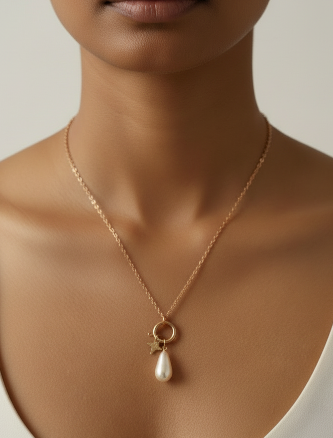 This elegant piece features a smooth teardrop pearl pendant paired with a delicate star charm, both hanging from a bold 18K PVD gold plated ring.