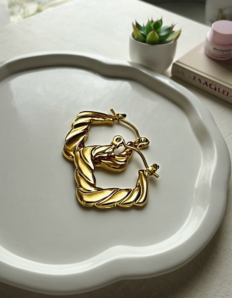 Turn up the shine with these statement twisted gold hoops — a timeless blend of boldness and elegance. Crafted to catch the light from every angle, they elevate both day and night looks effortlessly.
